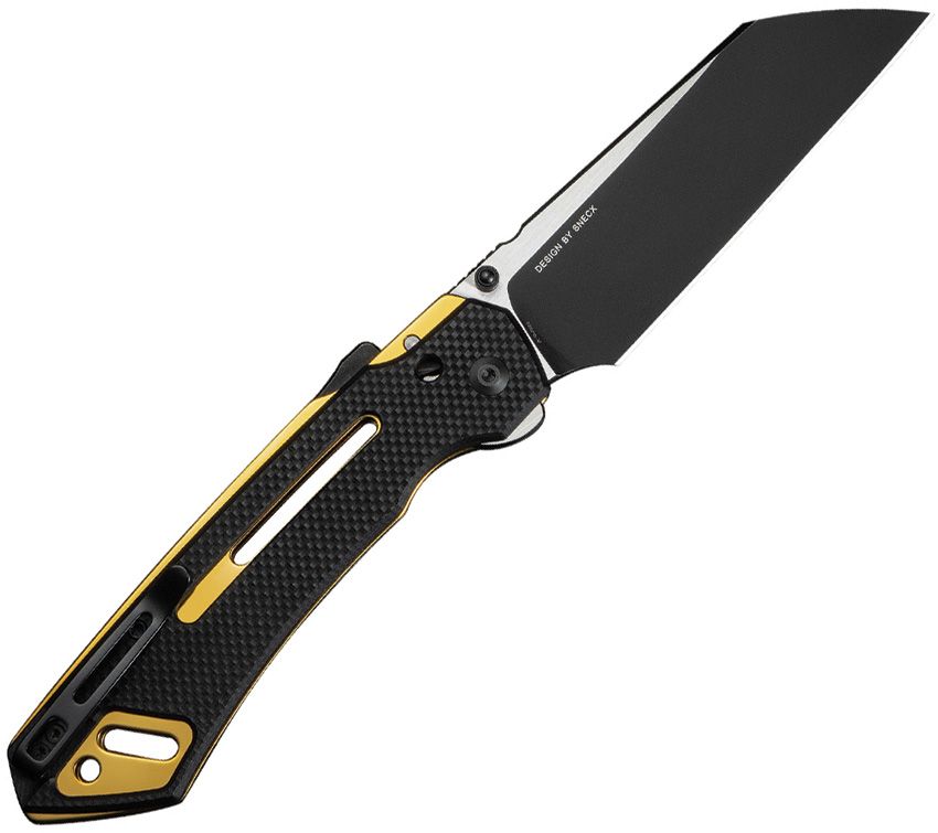 5.5" (13.97cm) closed. 4.25" (10.8cm) two-tone finish Nitro V steel sheepsfoot blade. Black textured G10 handle. Thumb stud. Extended tang. Pocket clip. Gold accents. Black nylon zippered storage case. Boxed.